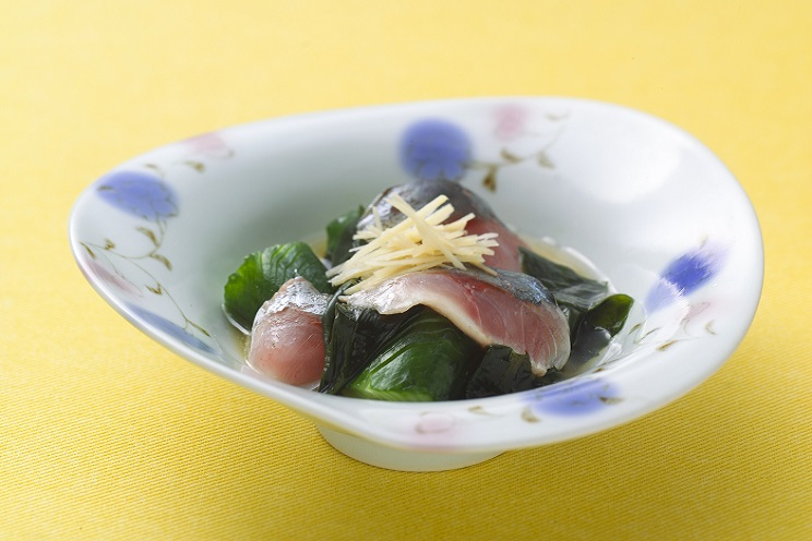 - 6塩をしてしんなりさせて水けをきったきゅうりとあじ、わかめを盛り、⑤をかけ、しょうがを添える。