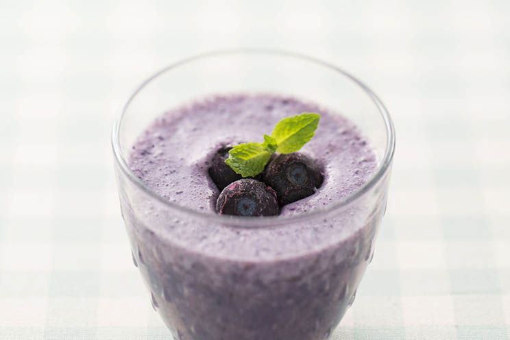 - 1冷凍バナナは一口大にし、ミキサーにブルーベリーと牛乳の半分の量と一緒に入れ、撹拌する。