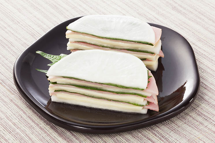 - 1千枚漬・スライスチーズ・スライスハム・大葉の順に重ねる。