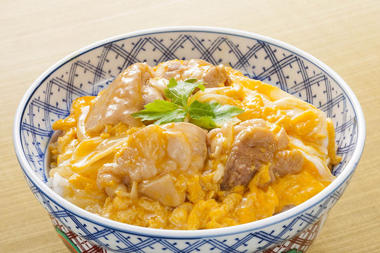 - 2溶き卵を回しかけ、半熟になったら、ごはんを盛った丼に盛り付ける。