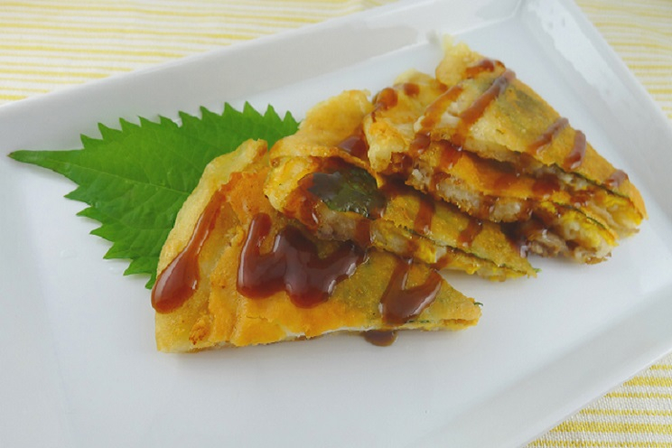 - 5ひっくり返し2分焼いて、豚肉をカリッとさせ、青じそ、チーズの順でのせ、最後にひっくり返し1分焼く。