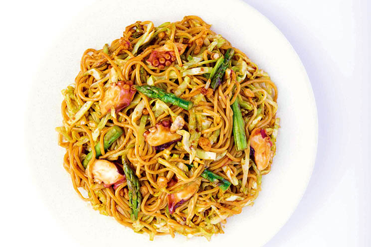 - 4フライパンでタコとアスパラガスを1分炒める。アスパラガスに火が通ったら、キャベツ、天かすの順にのせて、③で炒めた麺をかぶせて2分半蒸し焼きにする。