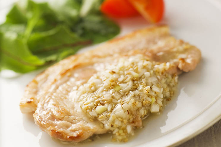 4. 4食べやすい大きさに豚肉をカットし、②のたれを上からかける。