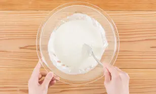 生地にキャベツ300g、青ねぎ10g、「天かす天華」1袋、たまご2個を入れ、空気を含ませるように混ぜます。