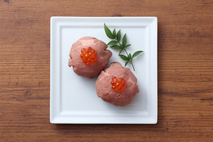 - 2ラップにローストビーフを1枚広げ、酢飯をのせて丸く包む。同様に計8個つくってラップを剥がし、いくらをのせる。
