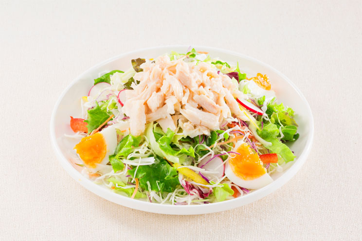 1. 1ミックス野菜の上にほぐしたサラダチキンをのせる。