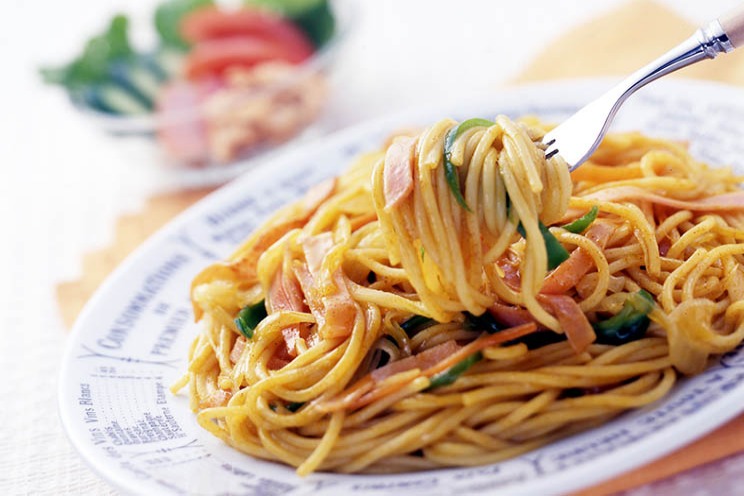 - 3フライパンに油を熱し、たまねぎ、にんじん、ピーマン、ハムを炒め、パスタを加える。