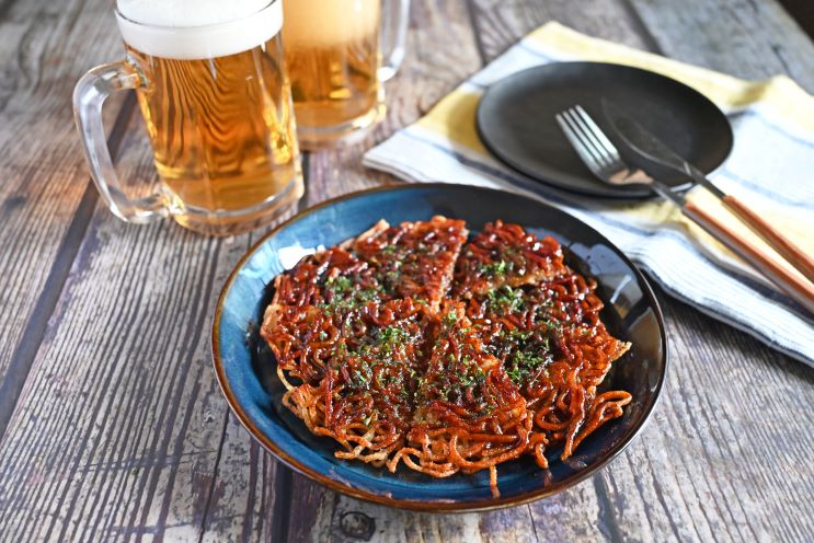 - 4焼そばソースを麺にまんべんなく塗り広げ、裏返し、中強火で30秒程度焼く。
