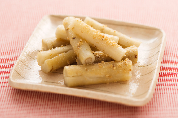 - 1ごぼうは皮をむいて袋に入れ、めん棒で軽くたたき4~5cmの長さに切る