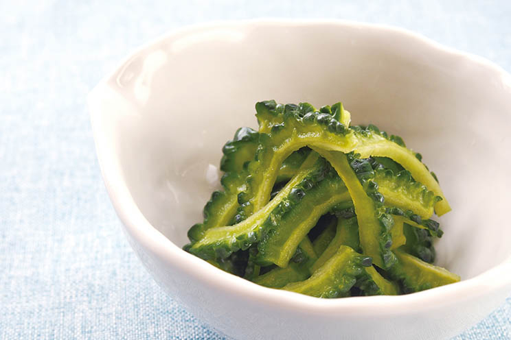 - 1ゴーヤは縦半分に切り、綿状の種をスプーンでかき出し、5~6mm厚さの半月切りにする。塩(小さじ0.5)をまぶして、15分くらいおく。