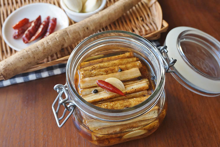 4. 4容器に③を入れて、にんにく、唐辛子、ブラックペッパー、ごま油を加える。らっきょう酢を注いで冷蔵庫で一晩味をなじませる。