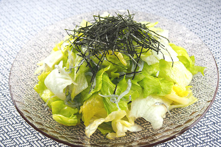 - 2レタス、しらす、ごま油、たちまちうまい酢を混ぜ合せる。