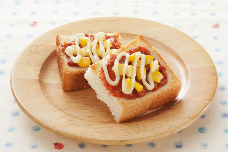 - 1食パンの上に、1歳からのケチャップソース、ツナ、コーンの順にのせ、1歳からのノンエッグマヨをかける。