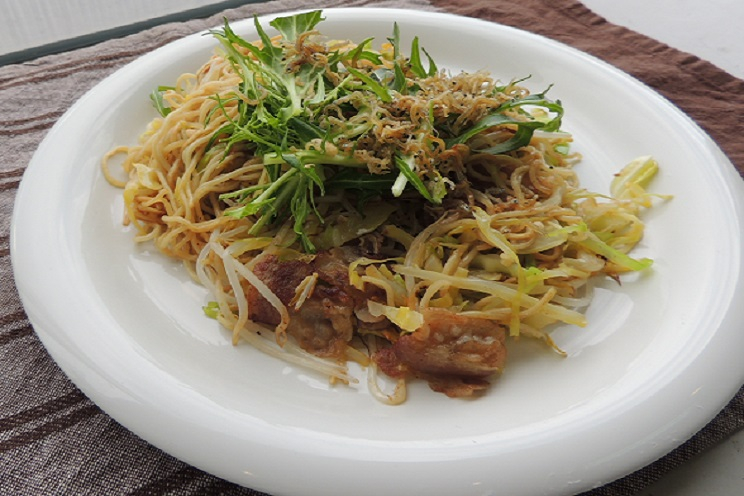 - 1フライパンで麺を炒め、かつお粉をかけてほぐす。5分炒めたら一度お皿にとる。