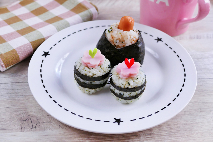 - 6⑤を2等分して小さな俵型のお結びを作り、海苔をくるくると巻く。平らな表面を上にしてロースハムの桜を3枚ずつのせ、真ん中をピックで固定する。