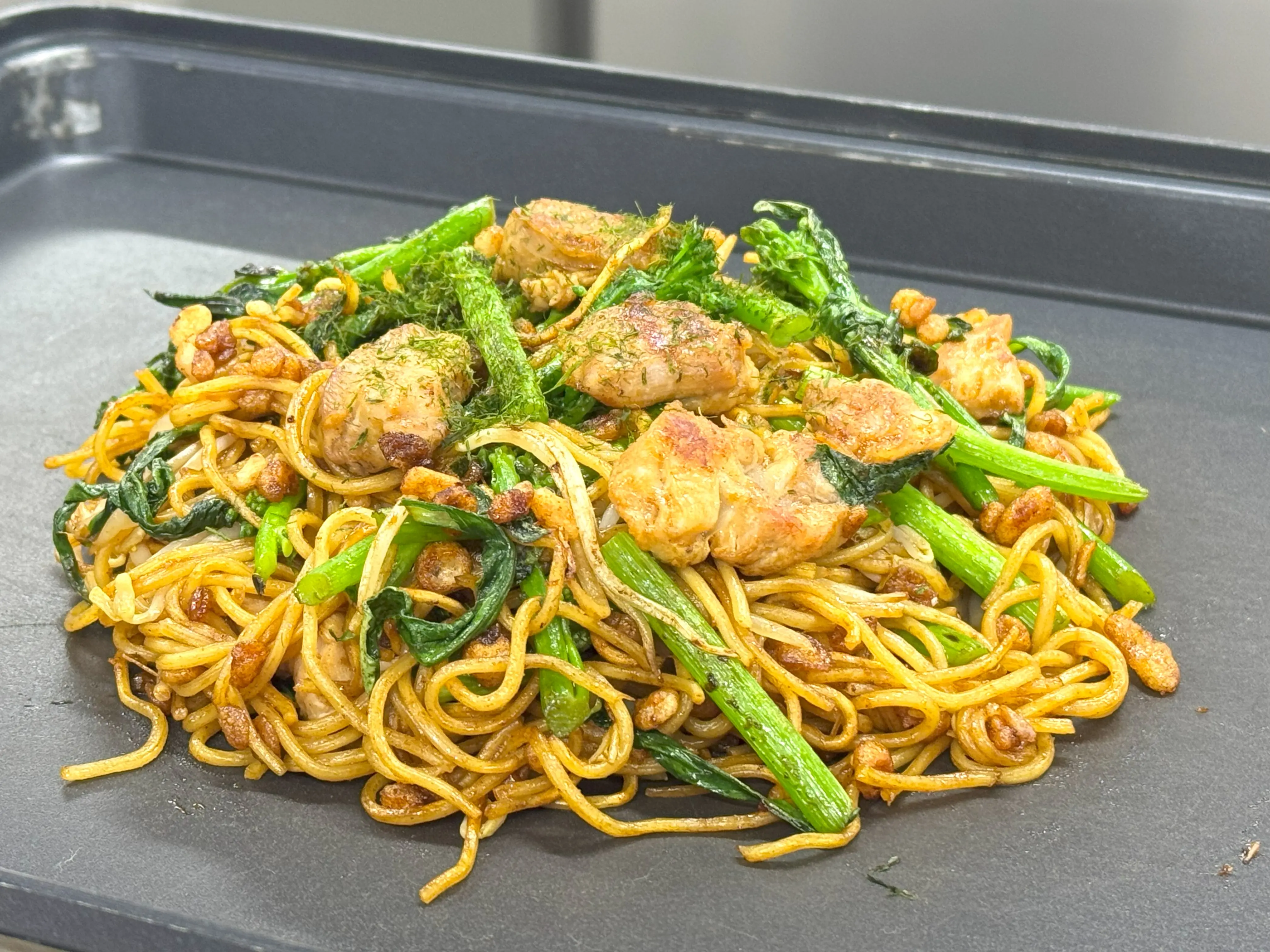 - 3もやし、天かす天華、焼そばソースを入れ、全体を絡め、炒めて仕上げる。