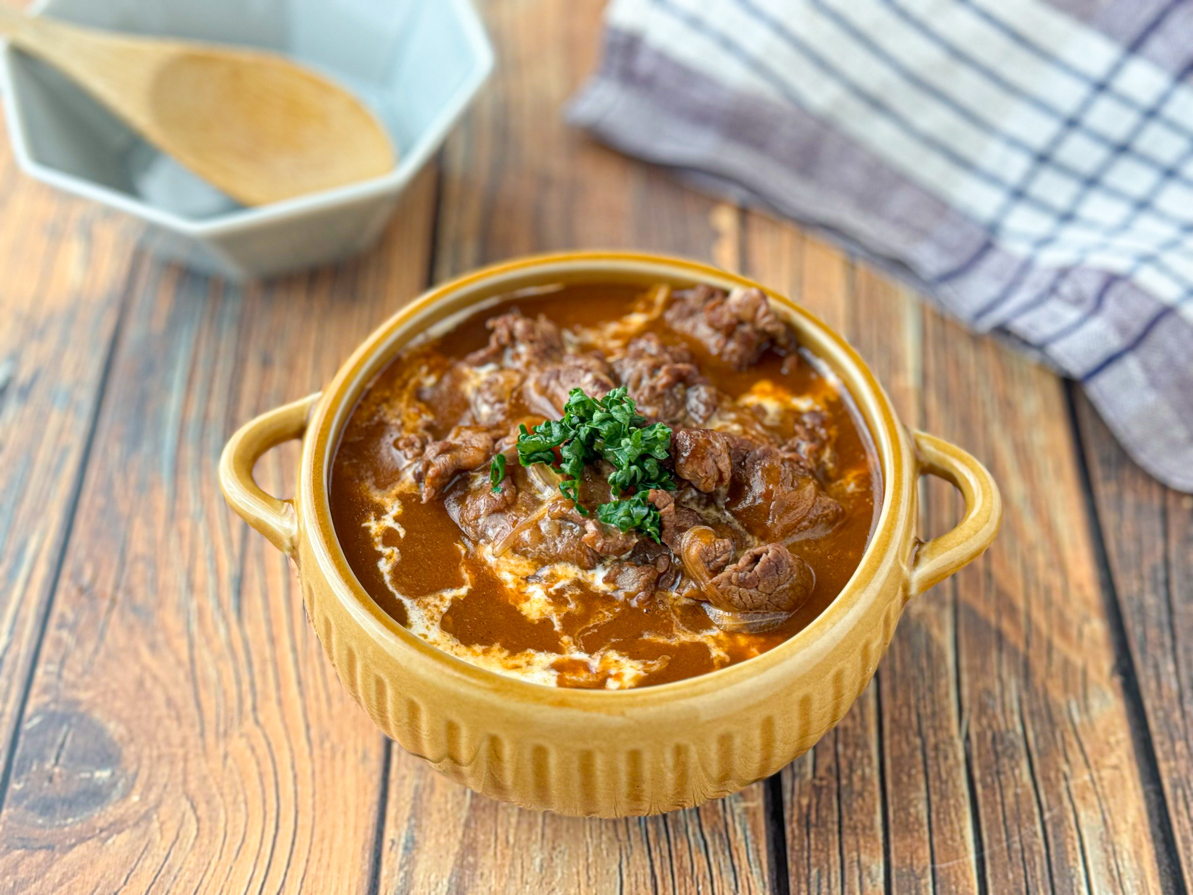 - 4③に水を加え、中火にし、時々混ぜながら5分ほど煮込む。バターを加えて溶かす。