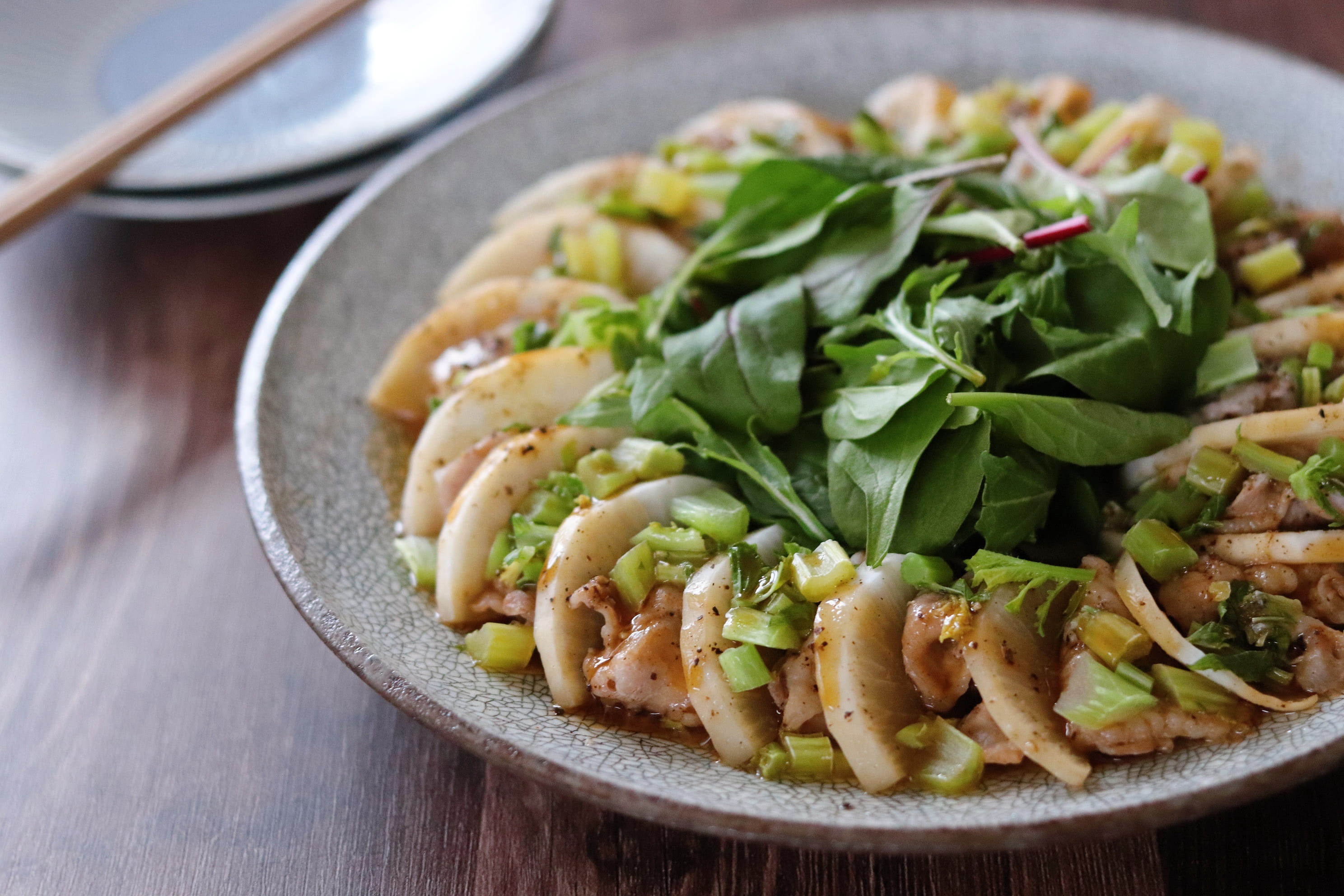 - 3②に<A>を大さじ6ほど回しかけ、塩、粗挽き黒こしょうをふり、あれば大根の葉を散らす。
