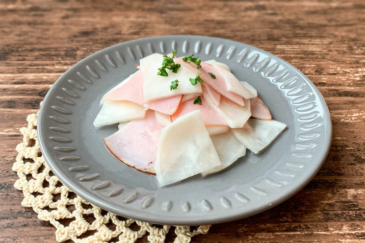 - 1かぶは薄切りにし、塩をふってしばらく置き、しんなりとしたらさっと水洗いをして水けをしぼる。