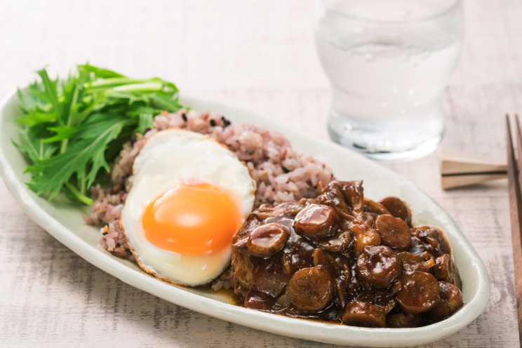 - 6器にご飯と⑤を盛り付け、水菜と目玉焼きを添える。