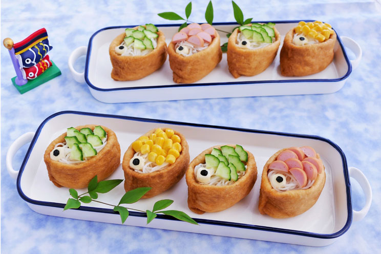 - 4稲荷皮1 枚を袋状に広げ切り口を 2cmくらい内側に折り込む。③のビーフン 1 個分の半量を詰めエー・ラベルふりかけおかか 小さじ1/2 をふり残りのビーフンを詰める。表面の具をのせる場所にノンエッグマヨを絞る。鯉のぼりのうろこに見えるようにきゅうり、ポークウイニー、コーンをそれぞれのせる。ノンエッグマヨを丸く絞り白目をつくる。そこに海苔の黒目をのせる。同様に全部で8個つくり、器に盛る。
