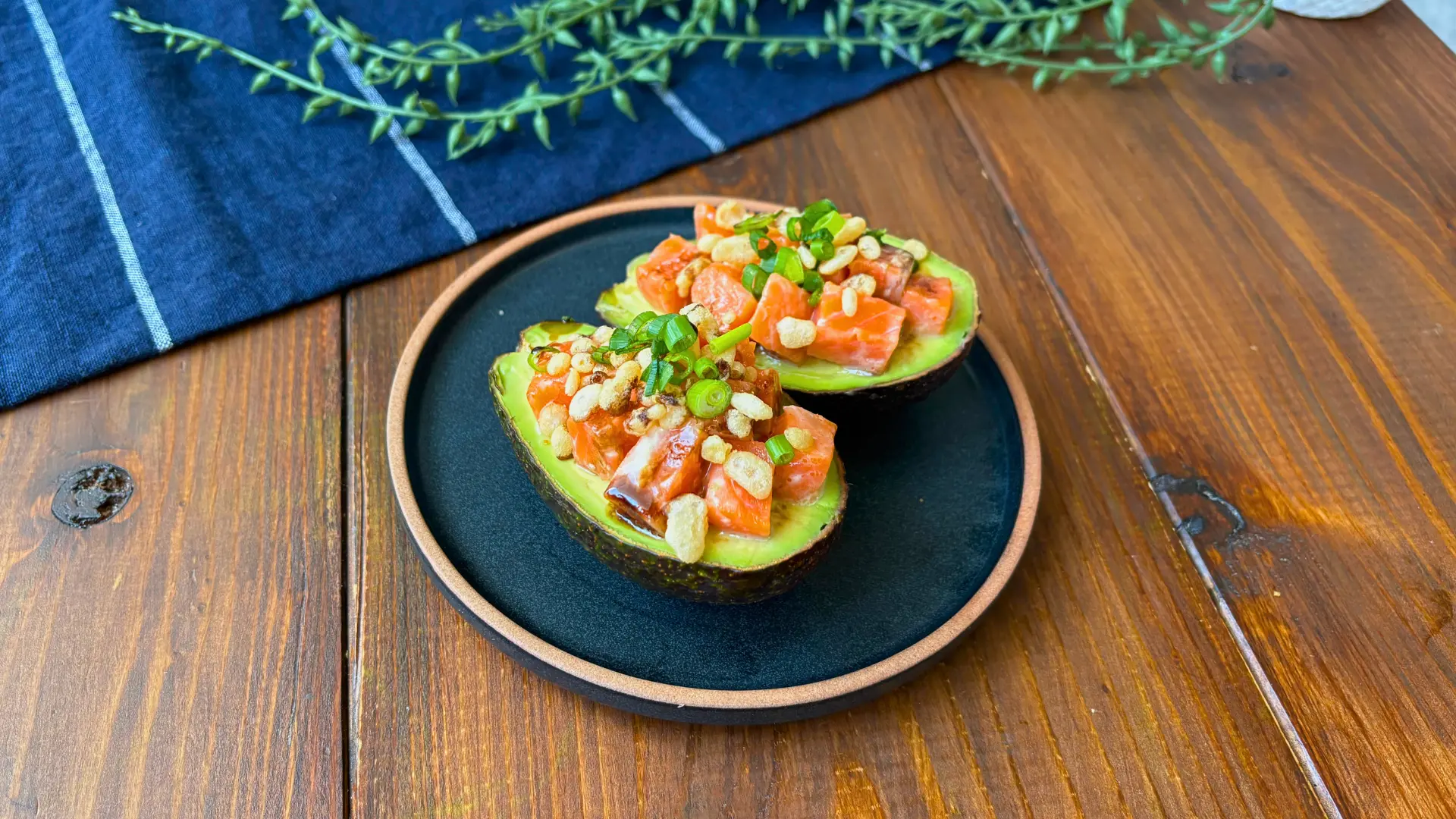 - 3①のサーモン、天かす天華、青ねぎをのせ、お好みでバルサミコソースをかける。