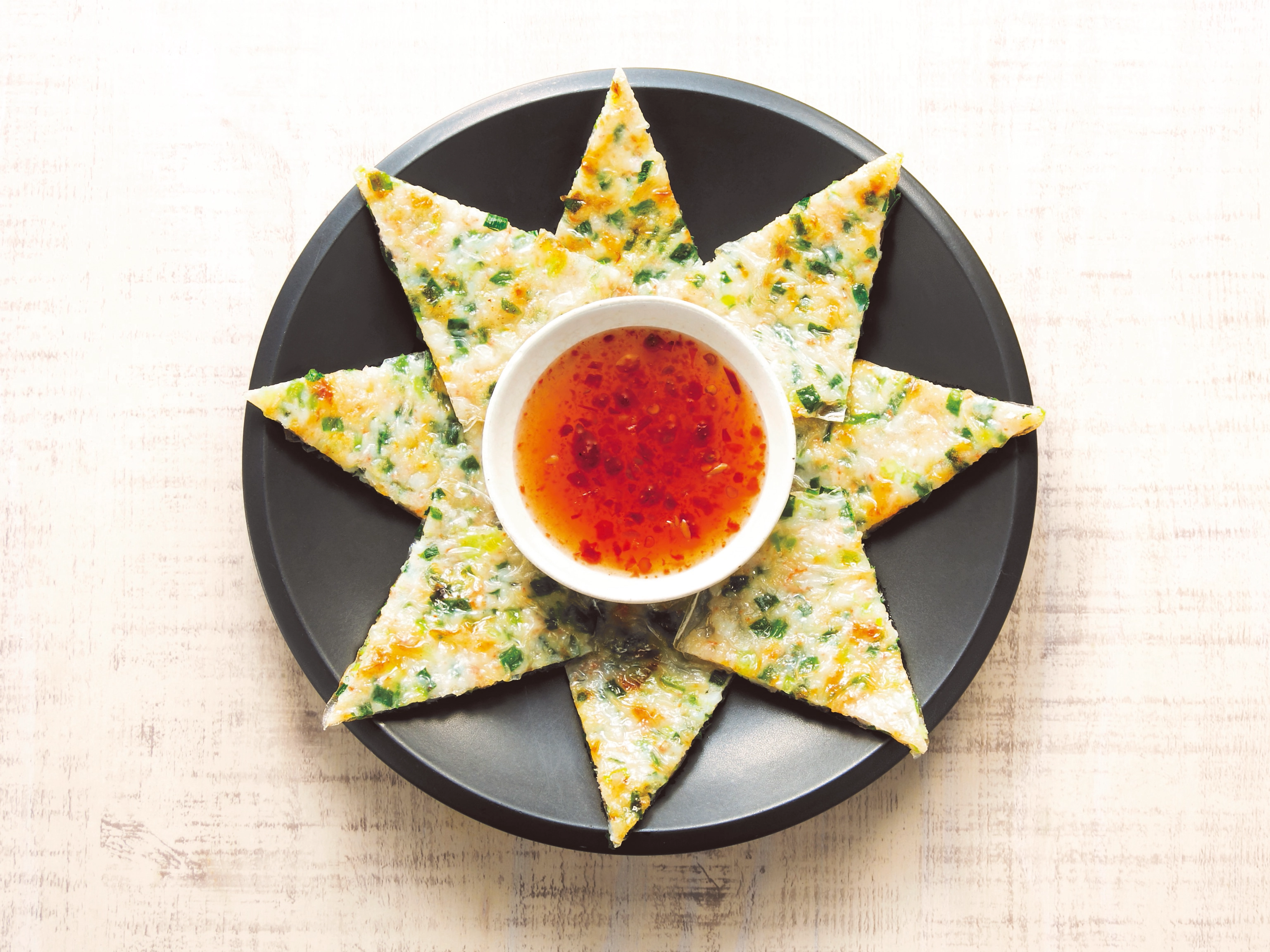 フタをして3~4分蒸し焼きにし、裏返してさらに2分焼き、中まで火を通す。 - 5食べやすい大きさに切り、よく混ぜ合わせた<タレ>につけていただく。