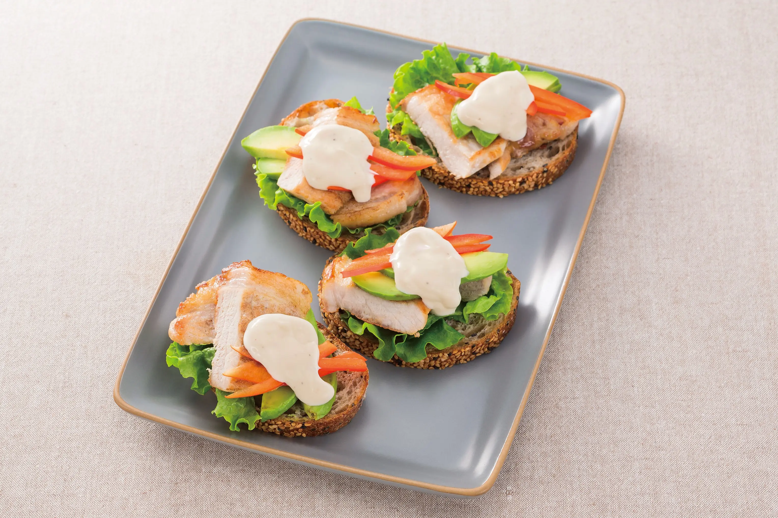 - 4パンにちぎったグリーンリーフ、薄切りしたアボカドとパプリカ、③をのせ、②をかける。(4つ作る)