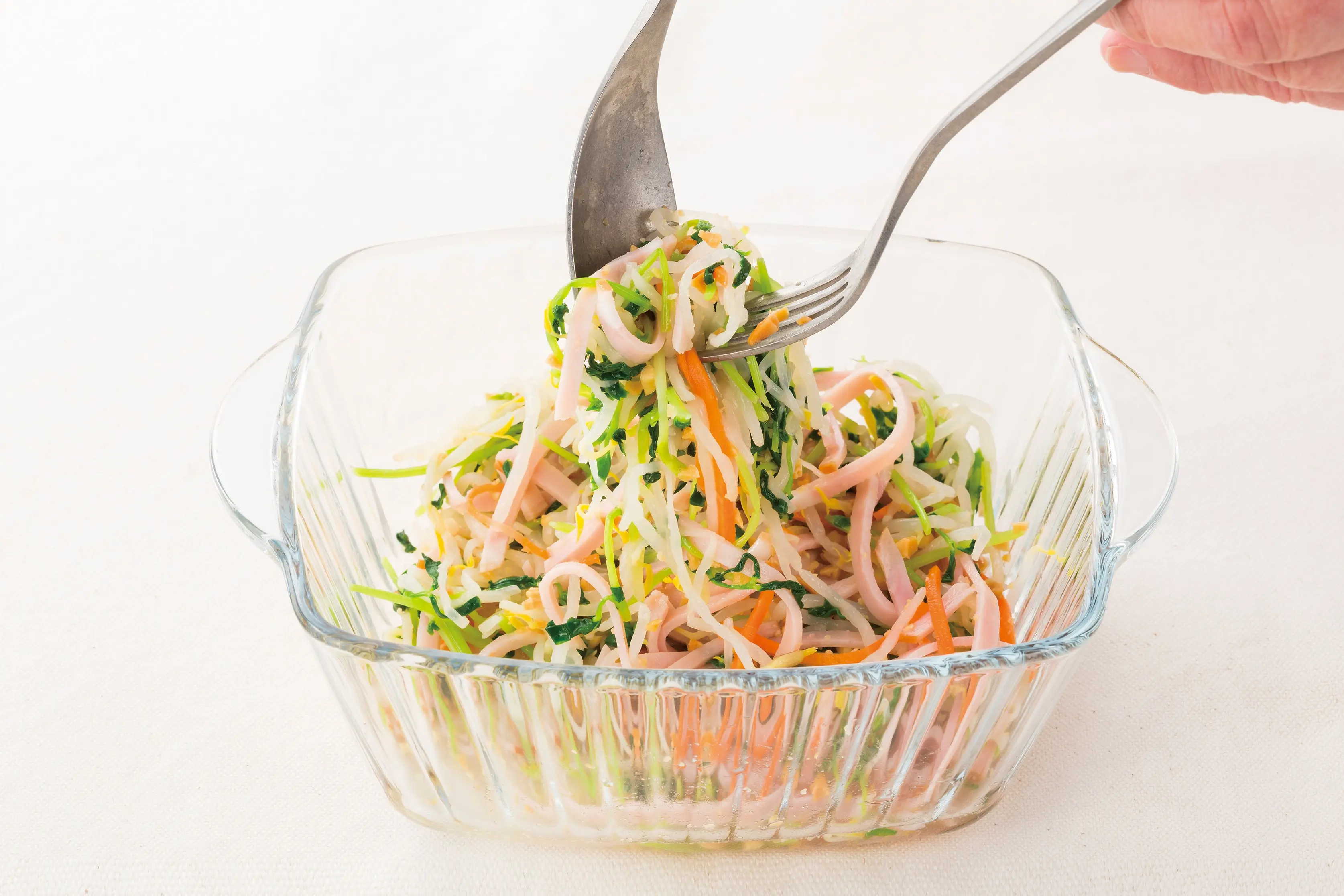 - 3ボウルに①、②を入れ、たちまちうまい酢で和える。