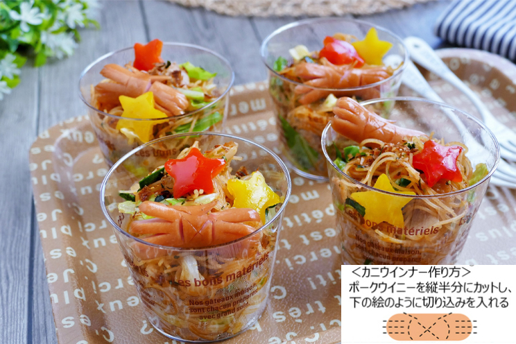 フライパンに薄く油(分量外)を熱し、星型にくり抜いた赤・黄パプリカを一緒に炒め、ウインナーの切り込みが開いたら、皿に取り出して置く。 - 2<焼ビーフンを作る>豚バラ肉、キャベツは一口大に切る。