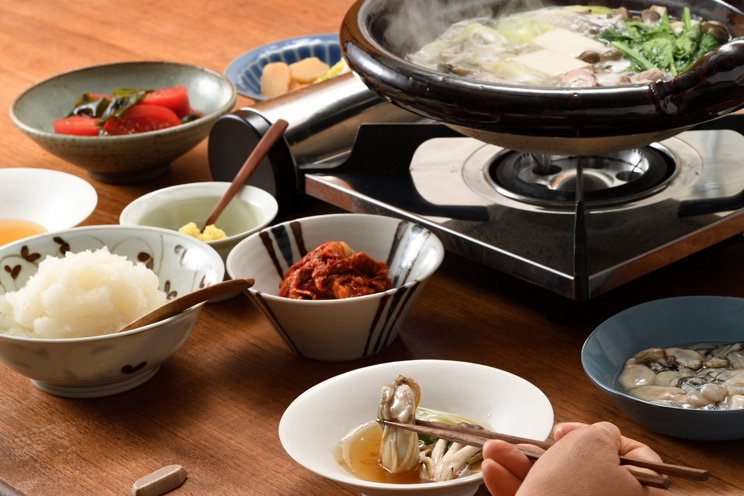 - 3①の昆布だしがよく出てきたら酒と粗塩を入れる。温まったら具材を鍋に入れ、だしあんかけにつけていただく。