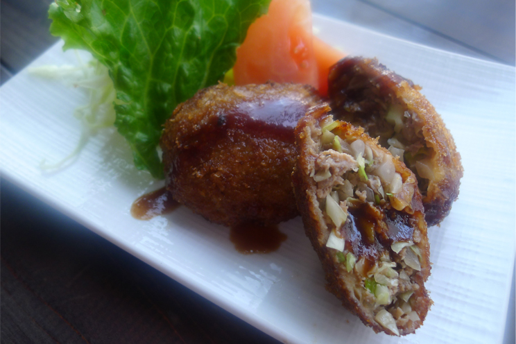 - 3②を好みの形に整え、小麦粉、溶き卵、パン粉の順に衣をつけ、揚げ油でカラっと揚げる。