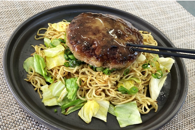 - 3サラダ油をひいたフライパンで焼そば麺を焼き目が全体につくまでしっかりと炒め、キャベツを入れ、火が通ったら塩焼そばソースを30g加え、炒める。