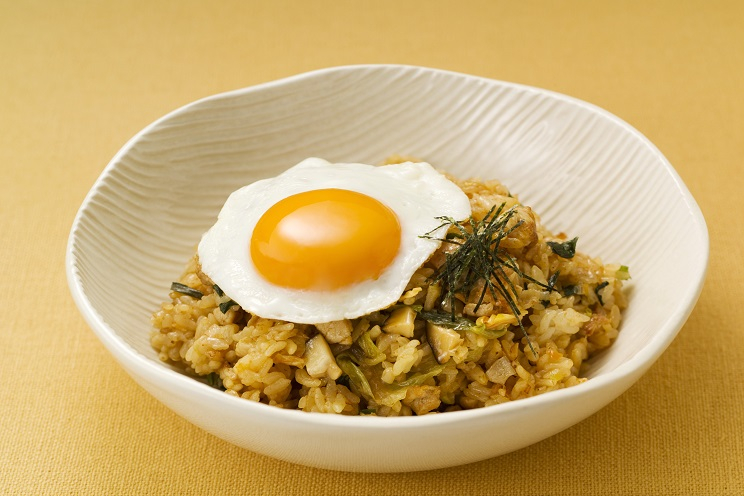 - 2中華鍋に油を熱し、豚肉、しいたけ、キムチ漬け、長ねぎを炒め、ごはんを加えてさらに炒める。