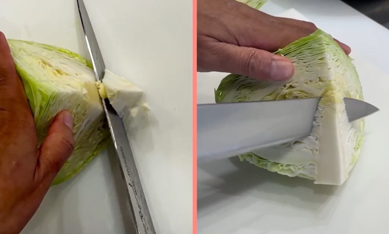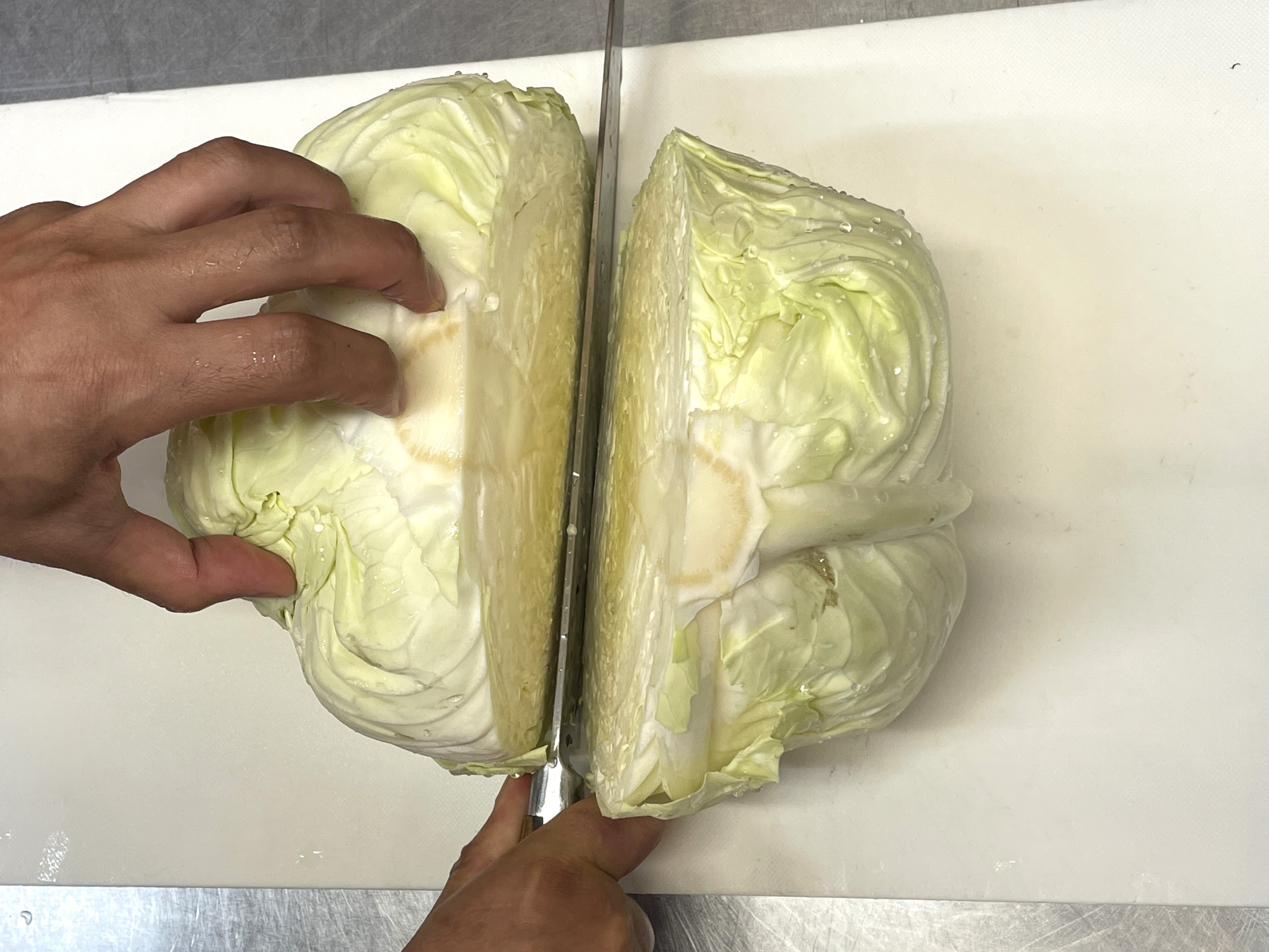 ⑤ キャベツを半回転させて包丁を入れ、3cmの角切りにします。