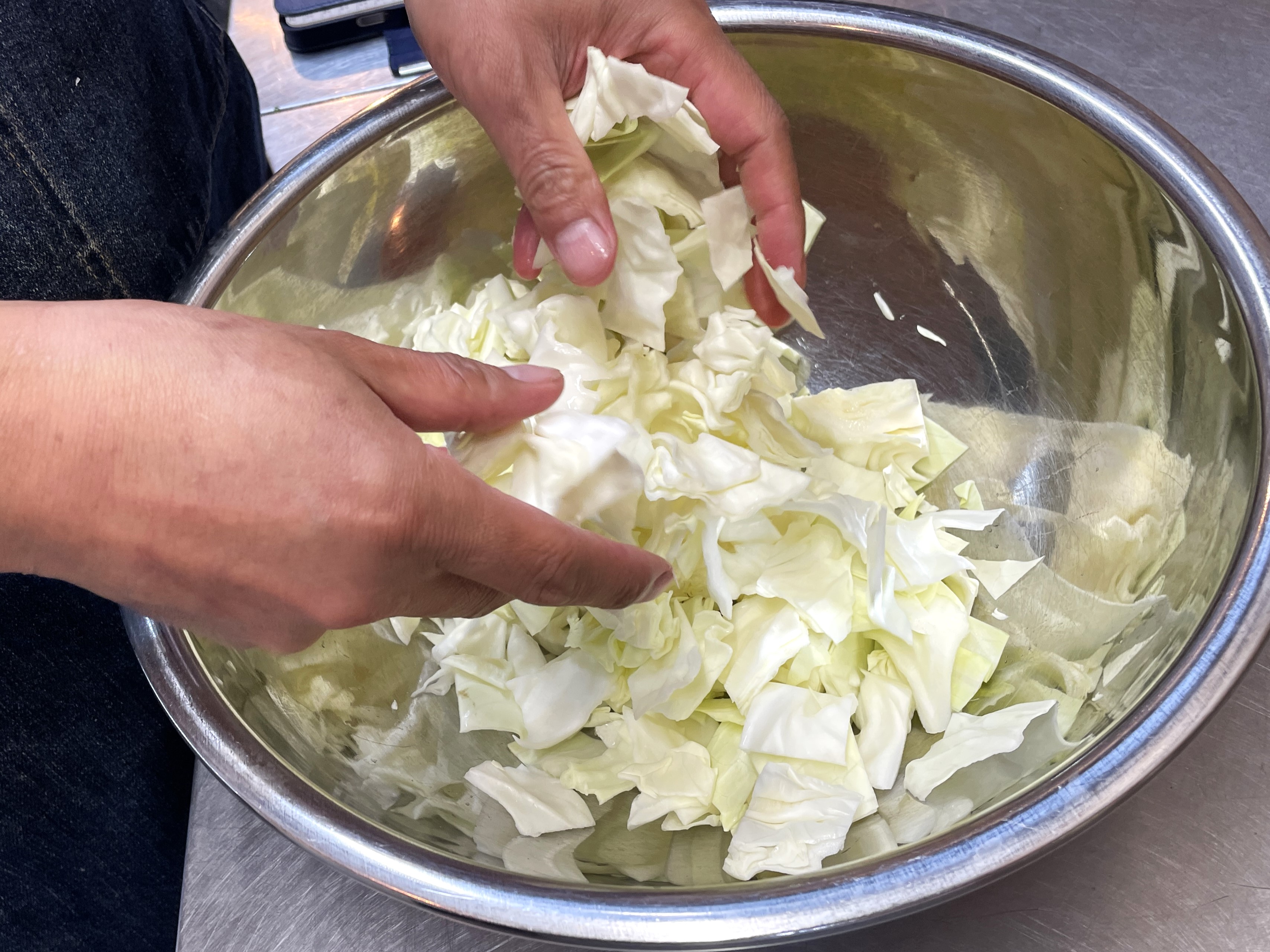 ⑦ ボウルの中で葉側と芯側をしっかり混ぜます。