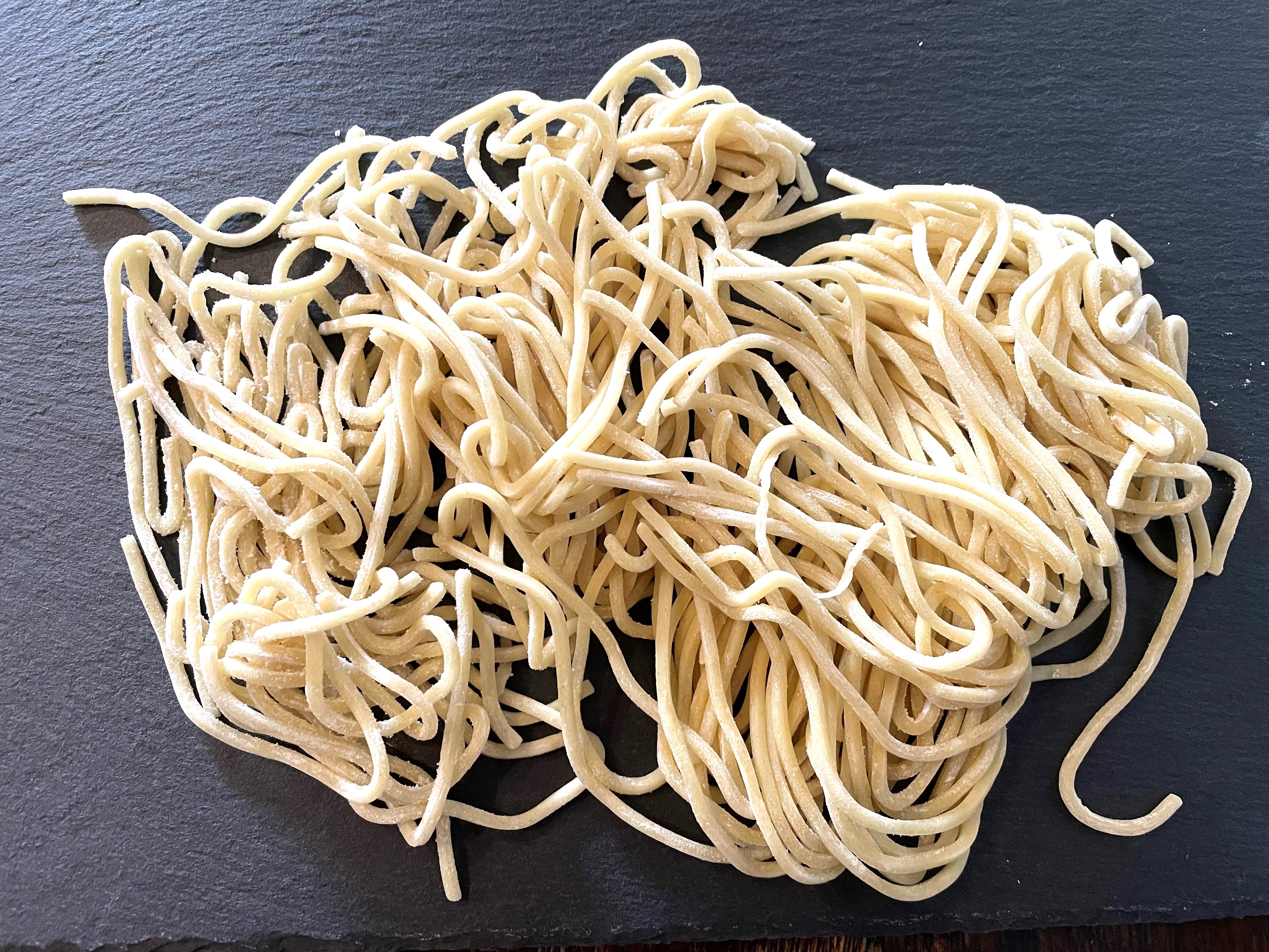 一般的な麺は、小麦粉、かんすい、食塩、水などの材料をミキサーに入れて混ぜ、麺帯にして寝かせ、ロールに通して薄く延ばし、切り刃で切り出します。生麺の場合はこれを丸めて出荷、蒸し麺は蒸した後、ゆで麺はゆでた後に冷却し、油などをまぶして包装して出荷されます。